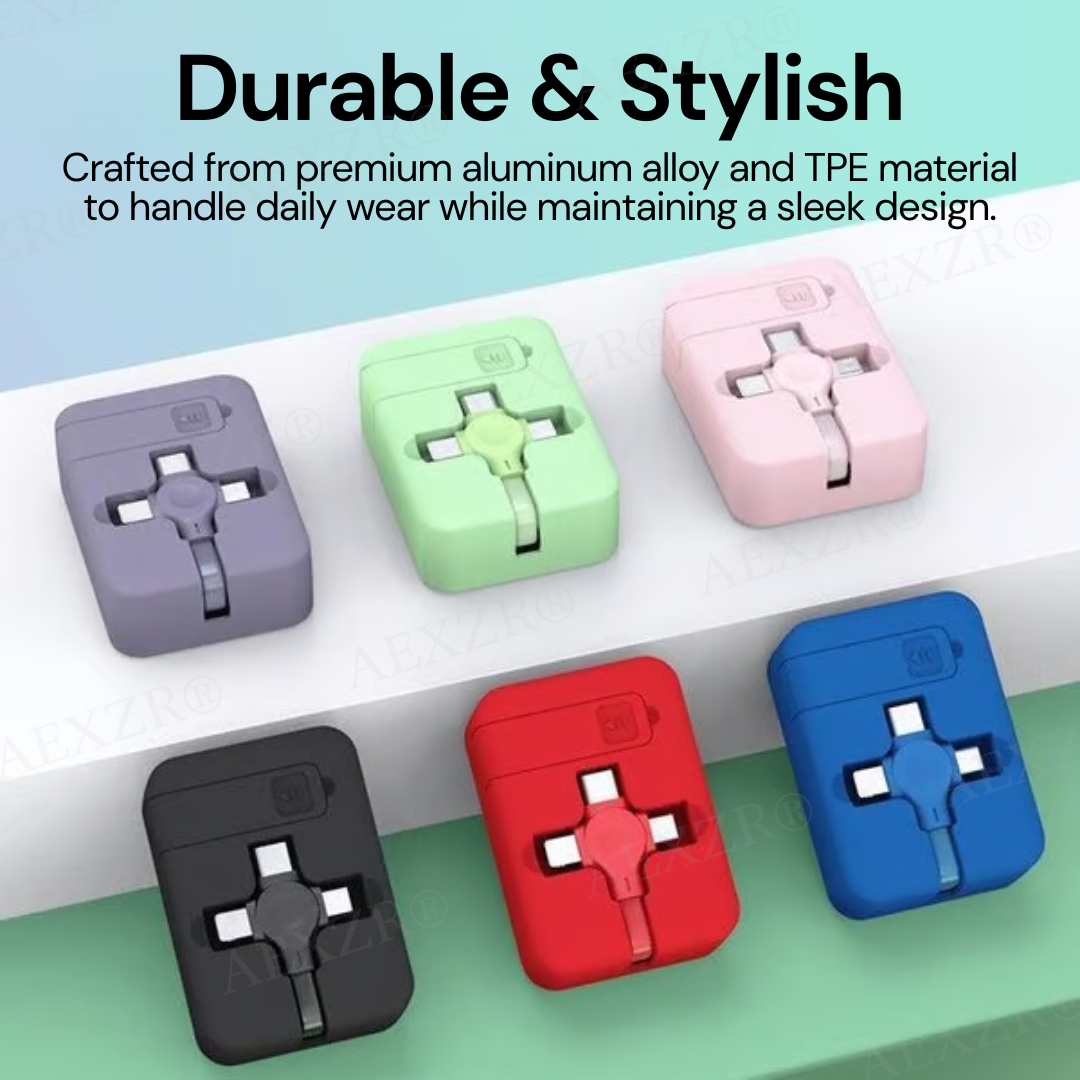 Its retractable, roll-up design keeps cables organized and knot-free, while the adjustable length gives you the flexibility to charge comfortably, whether you're working at your desk, lounging at home, or commuting. Plus, the built-in phone stand transforms it into the perfect hands-free companion for watching videos or video calling on the go. Lightweight, durable, and pocket-sized, the AEXZR® cable roll delivers fast charging, efficient data transfer, and total convenience—all in one sleek, compact device. It’s more than just a cable—it’s your everyday charging essential.